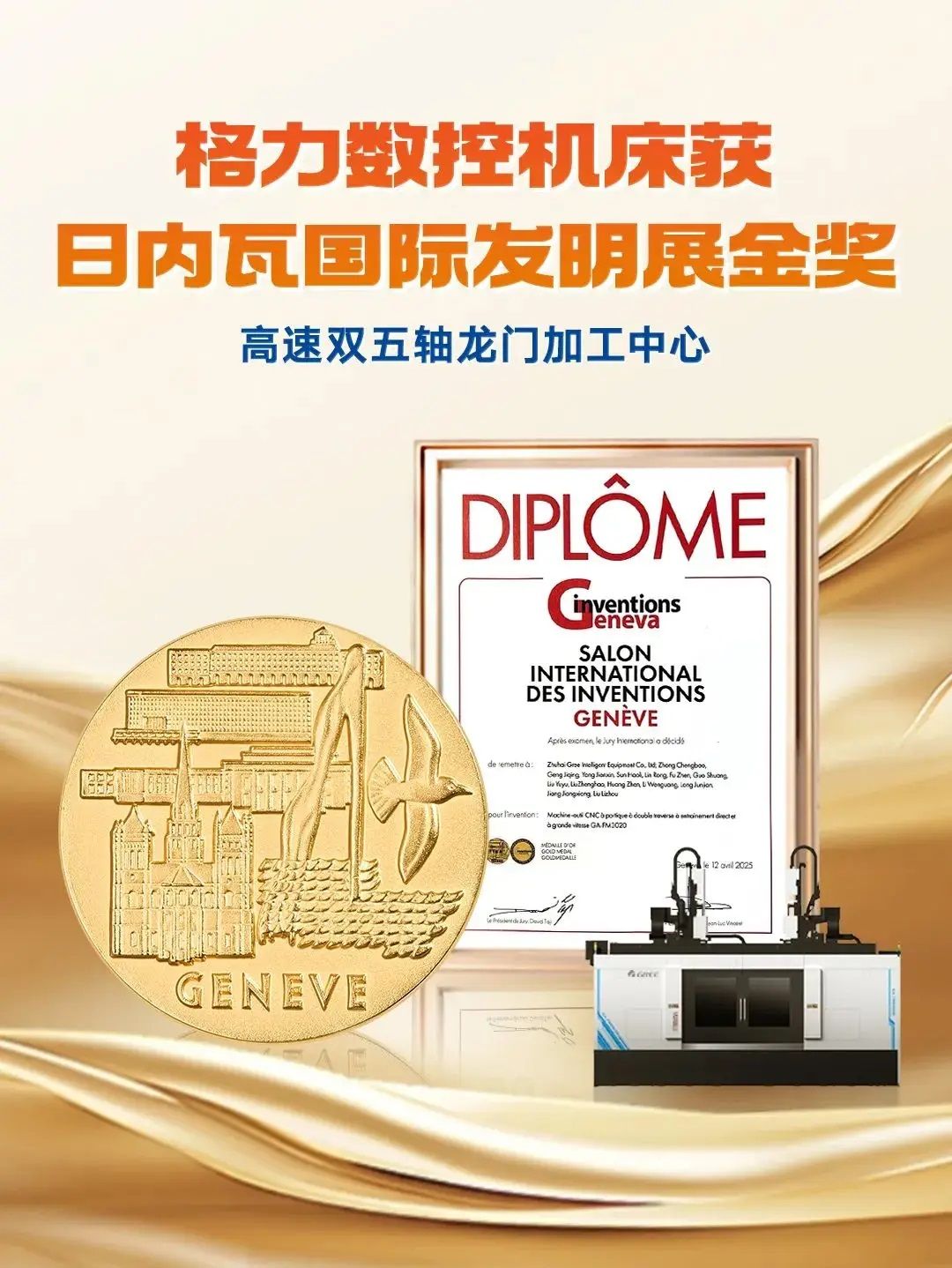 At the 50th Geneva International Invention Exhibition held earlier,GREE's independently developed CNC machine tool "GA-FMB3020D High-Speed Dual Five-Axis Portal Machining Center" stood out among over 1,000 invention projects worldwide and won the Gold Award.